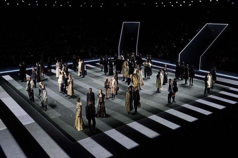 本季 Dior 选择了一个极具戏剧性的伸展台设计,由视觉艺术大师 Robert Wilson 操刀,营造出一个充满流动感的世界。灰黑色基调的舞台上,几何条纹与对角线视觉效果带来错视感,呼应了整场秀对于时间与风格流变的探讨。现场灯光变换,从深邃暗影过渡到柔和光芒,如同一场梦境式的叙事:一座鞦韆悬于空中、史前鸟的影像投射在幕布上,直到最终浮现冰山意象,象徵着时尚在时间洪流中的永恆与变迁。
