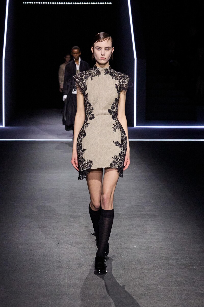 Maria Grazia Chiuri 再次向 Dior 的历史档案致敬,将不同时期的元素进行当代诠释。他本季重新审视 Gianfranco Ferré 的建筑感剪裁,并融入他一贯的柔美结构,并以Dior 经典白衬衫成为本季核心符码。这一设计不仅挑战性别界线,还延续了品牌对于女性力量的探讨。